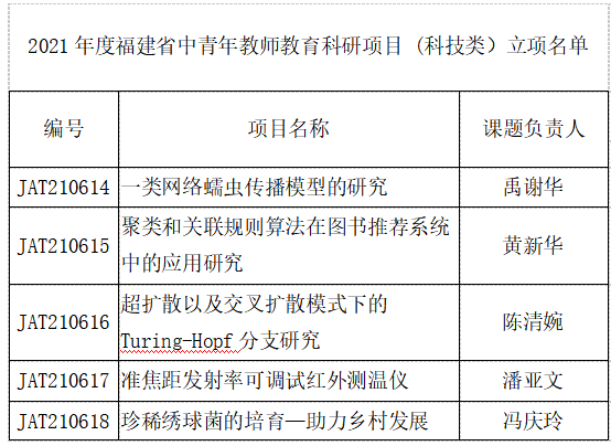 近日,根据《福建省教育厅关于公布2021年度福建省中青年教师教育科研项目(科技类)立项名单的通知》(闽教科〔2021〕24号),乐鱼网页版登录入口_乐鱼(中国)5项课题获批立项。