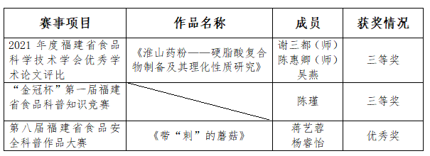 近日,由福建省科学技术学会、泉州市人民政府主办的第二十一届福建省科协年会专项活动——食品科技高峰论坛落下帷幕。论坛涵盖多项赛事项目,乐鱼网页版登录入口_乐鱼(中国)生命科学与化学学院师生分别在2021年度福建省食品科学技术学会优秀学术论文评比、“金冠杯”第一届福建省食品科普知识竞赛、第八届福建省食品安全科普作品大赛中喜获佳绩。