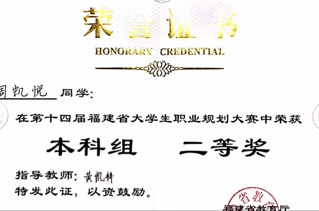 11月19日,由福建省教育厅主办的第十四届福建省大学生职业规划大赛总决赛和颁奖典礼在福建技术师范学院举行。乐鱼网页版登录入口_乐鱼(中国)2021级市场营销专业(专升本)周凯悦同学获得大赛本科组二等奖。