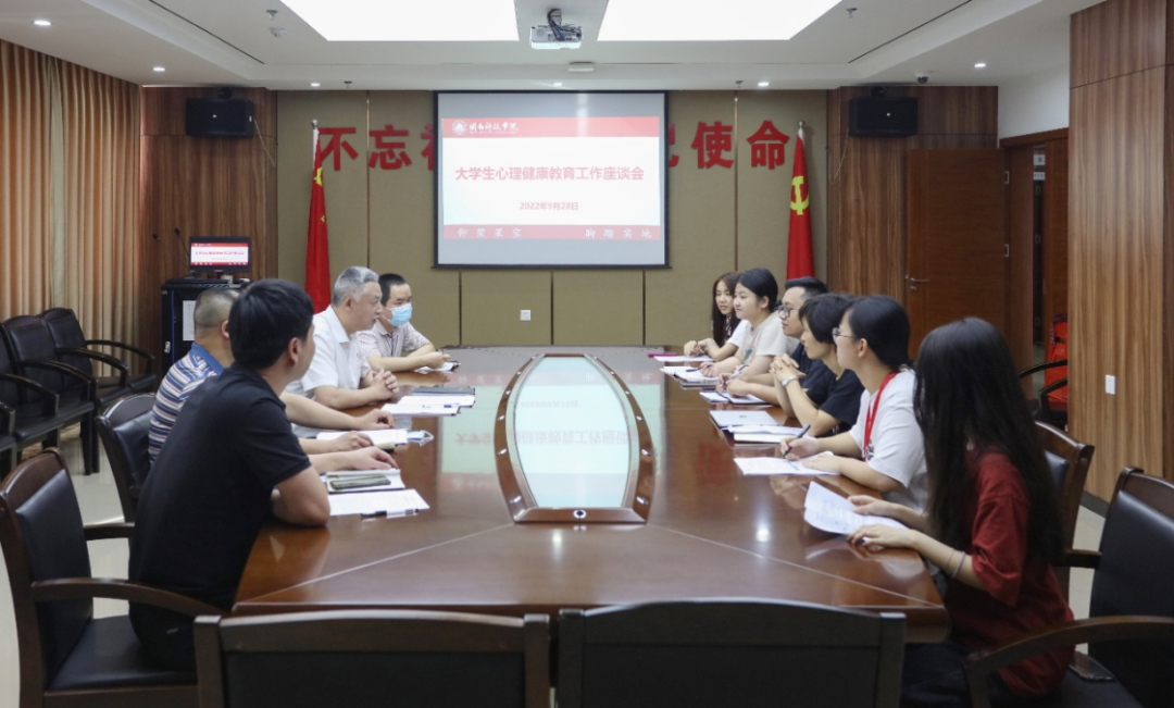 9月28日下午,乐鱼网页版登录入口_乐鱼(中国)召开大学生心理健康工作座谈会,校领导李旭、林树生,宣传部、学生工作处相关负责人,心理健康教育中心专职教师、大学生心理健康协会学生代表出席会议。