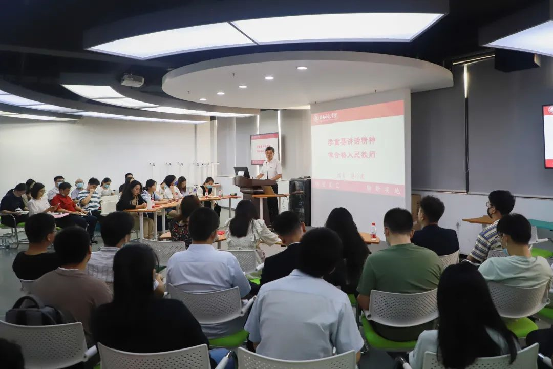 校长游小波以《学重要讲话精神,做合格人民教师》为题为新入职教师讲授第一课。他勉励所有新教师要团结合作、同心同德、齐心协力,为学生成长和学校发展贡献力量,并对新入职教师提出六点希望和要求:要忠诚敬业,要充满爱心,要有责任心,要学识扎实,要服务学生,要有人格魅力,从落实立德树人根本任务的高度全面审视,从担当培养德智体美劳全面发展的合格接班人的历史责任角度,树为师之志、立为师之德和强为师之能。