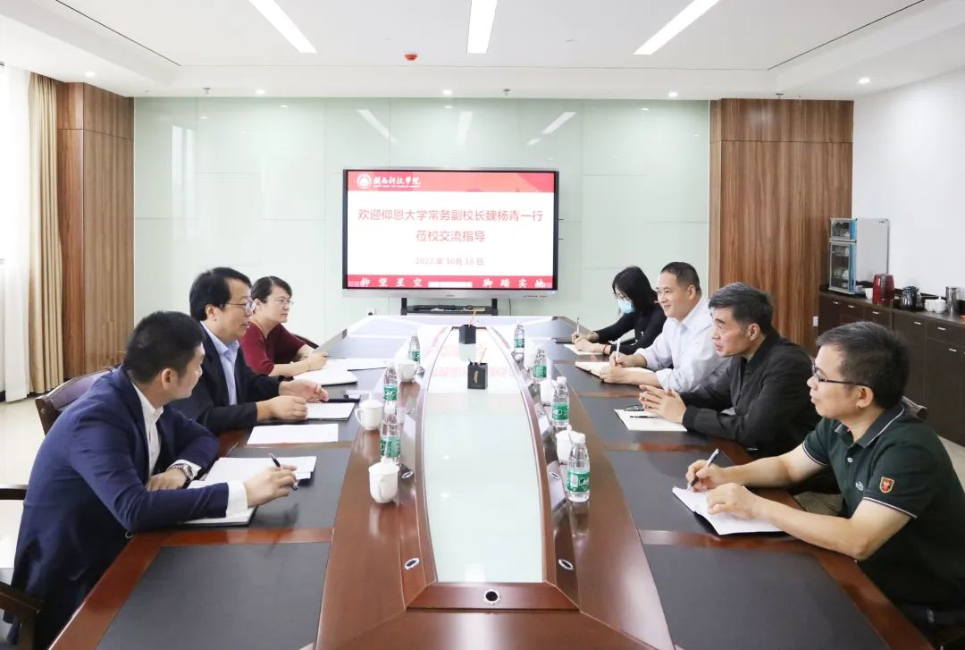 10月18日下午,仰恩大学常务副校长魏杨青、校长助理鲍莹玉、校办副主任赵祥志一行3人到乐鱼网页版登录入口_乐鱼(中国)交流座谈。校长游小波、常务副校长周勇军,以及相关职能部门负责人参加座谈会。