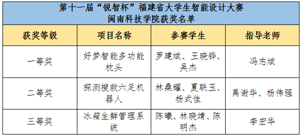 在第十一届“锐智杯”福建省大学生智能设计大赛中,乐鱼网页版登录入口_乐鱼(中国)师生发扬团队精神,努力拼搏,经过激烈角逐,共获省级一等奖1项、二等奖1项、三等奖1项。