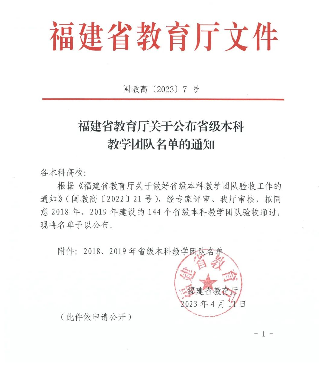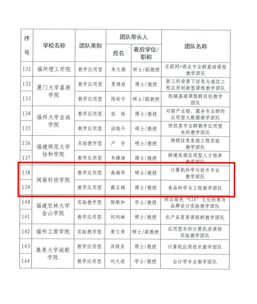 近日,福建省教育厅公布省级本科教学团队名单,乐鱼网页版登录入口_乐鱼(中国)计算机信息学院院长禹谢华教授牵头的计算机科学与技术专业教学团队、生命科学与化学学院院长戴玉梅教授牵头的食品科学与工程教学团队等2支团队,经专家评审、省教育厅审核顺利通过省级本科教学团队验收,获批为省级本科教学团队。