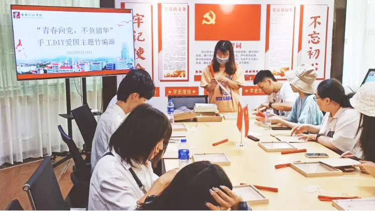 在“青春向党,不负韶华”爱国主题竹编画制作活动中,毕业班党员将想象力和创造力融入竹编画作品中,表达对党和祖国的无限热爱。