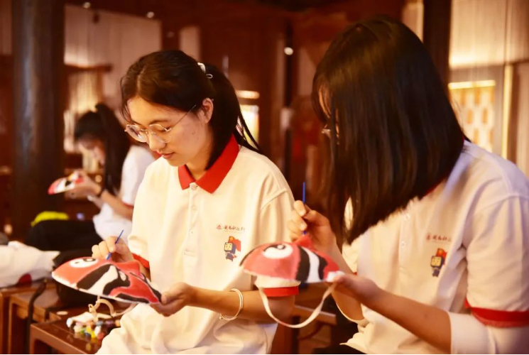 7月8日,实践队在专业老师的教学下,细致了解了戏剧脸谱的色彩、谱式,以及文化历史脉络,并结合现场演出,拿起画笔,勾线、调色、填涂,精心描绘出一张张惟妙惟肖的脸谱作品,在亲手实践中感受传统非遗文化。