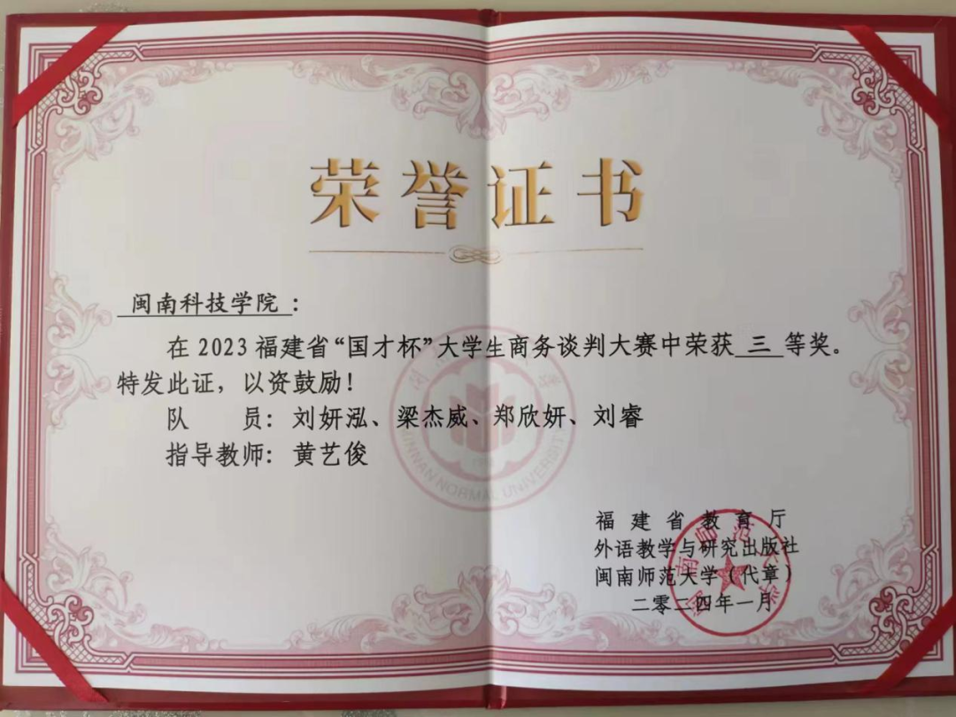 近日,由福建省教育厅主办的2023年福建省“国才杯”大学生商务谈判大赛公布获奖名单。乐鱼网页版登录入口_乐鱼(中国)人文学院参赛队伍(团队成员:刘妍泓、梁杰威、郑欣妍、刘睿,指导老师:黄艺俊)获三等奖。