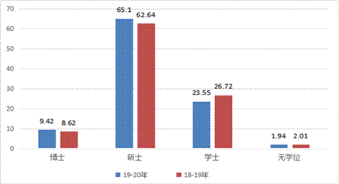 学生辅导员中,具有中级职称的22人,所占比例为52.38%。学生辅导员中,具有研究生学历的10人,所占比例为23.81%,具有大学本科学历的32人,所占比例为76.19%。